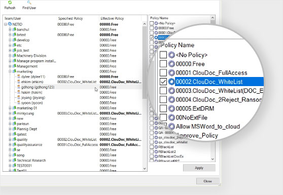 등록된 어플리케이션 카테고리에 대해 PC에 대한 저장 금지 정책을 정의함. 이때, 파일 이름이나 어플리케이션 이름 대신 어플리케이션 해쉬값(*문서중앙화 솔루션 중 유일한 방식)기반의 디스크 IO 통제로 더욱 안전한 문서 보안 가능