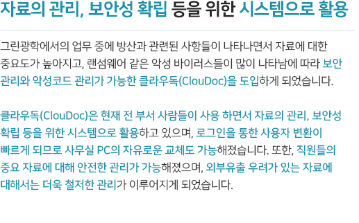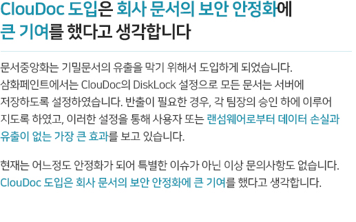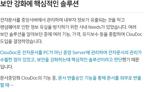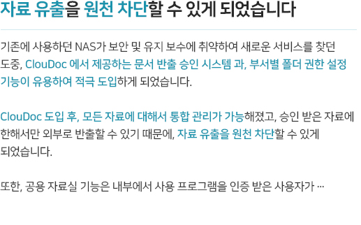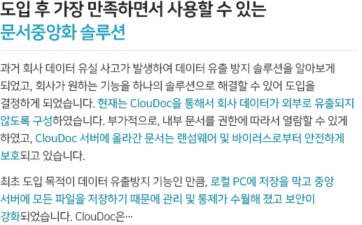 중요한 금융정보, 자산정보, 고객정보의 출력물들이 회사 캐비닛에, 책상에, 프린터기에. 손에 닿지 않는 곳에서 정보가 새어나가고 있을 수 있습니다. 모든 데이터의 로컬 저장을 금지하고,승인 받은 데이터만 공유하고, 프린터를 제어하며, 보호된 뷰어로 자료를 확인하게 하는 문서중앙화를 통한 페이퍼리스 환경을 구축해드립니다.