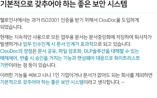 정보시스템 구축에 요구되는 "정보보호 사전점검 제도", 정보보호경영시스템 구축을 위한 "ISO 27001", 정보시스템과 개인정보보호 표준 "ISMS-P"에 요구되는 기술적, 물리적 보안 체계를 지원합니다. 문서보호, 암호화, 망분리, 랜섬웨어 및 악성소프트웨어 등의 위험관리를 위한 보안시스템운영, 백업 및 복구 등. mcloudoc은 보안 요구사항들을 한 번에 해소해 드립니다.