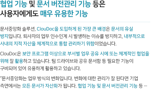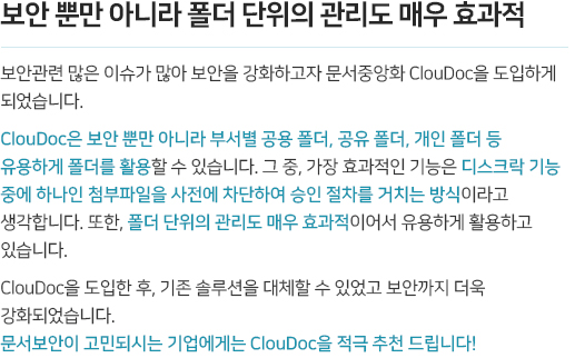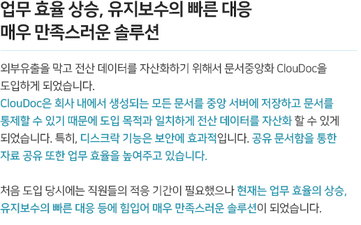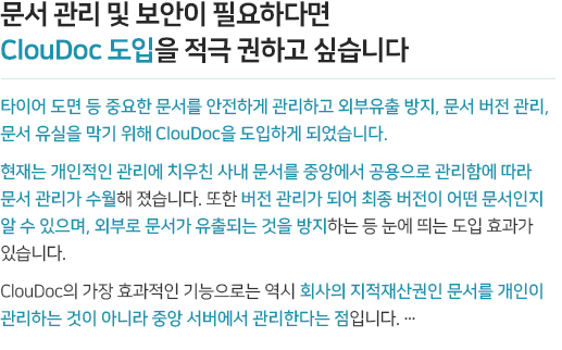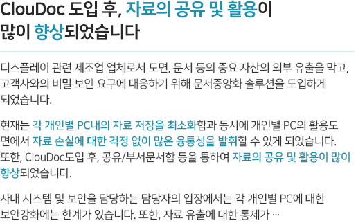 조직 간 유기적으로 연결되고 협업해야 하는 업무 환경을 위해 클라우드 스토리지 기반의 자료 공유시스템을 구현합니다. 또한 중앙화된 문서는 PC환경뿐 아니라 스마트폰, 태블릿 등 다양한 디바이스에서 활용할 수 있습니다. mcloudoc은 전용 뷰어를 제공하고 공유 문서를 폐기 시까지 관리하여 공유와 협업과정에서도 철저하게 정보를 보호합니다.